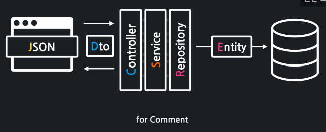 이를 위해서 RestController를 생성 하였고, 서비스와 협업 할수 있도록 CommentService를 생성하여 구현을 했다.