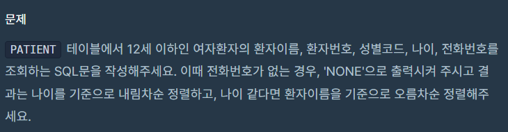 SELECT PT_NAME, PT_NO, GEND_CD, AGE, NVL(TLNO,'NONE') as TLNO
