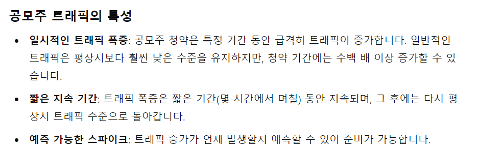 * 종량제(비용 효율성): 사용한 만큼만 비용을 지불합니다. 이는 공모주와 같은 트래픽이 일시적으로 급증하는 이벤트에 적합합니다.