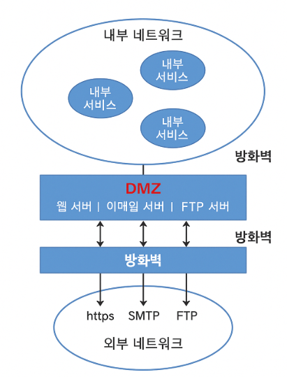 - 대부분의 조직은 웹사이트, 이메일 VPN, FTP 서버 처럼 외부에서 접근해야하는 시스템을 운영하는 필수이고 내부 네트워크는 고객 정보, 사내 시스템, DB 서버 등이 있어 외부와 바로 연결되면 해킹을 통해 노출될 수 있음.
