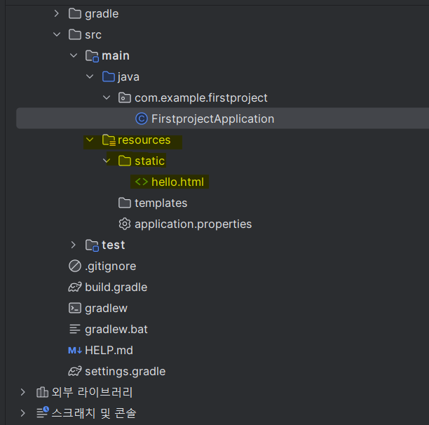 hello.html 이라고 직접 파일명을 명시했을 경우에는 resouces의 Static 폴더 안에서 해당 파일을 찾는다.